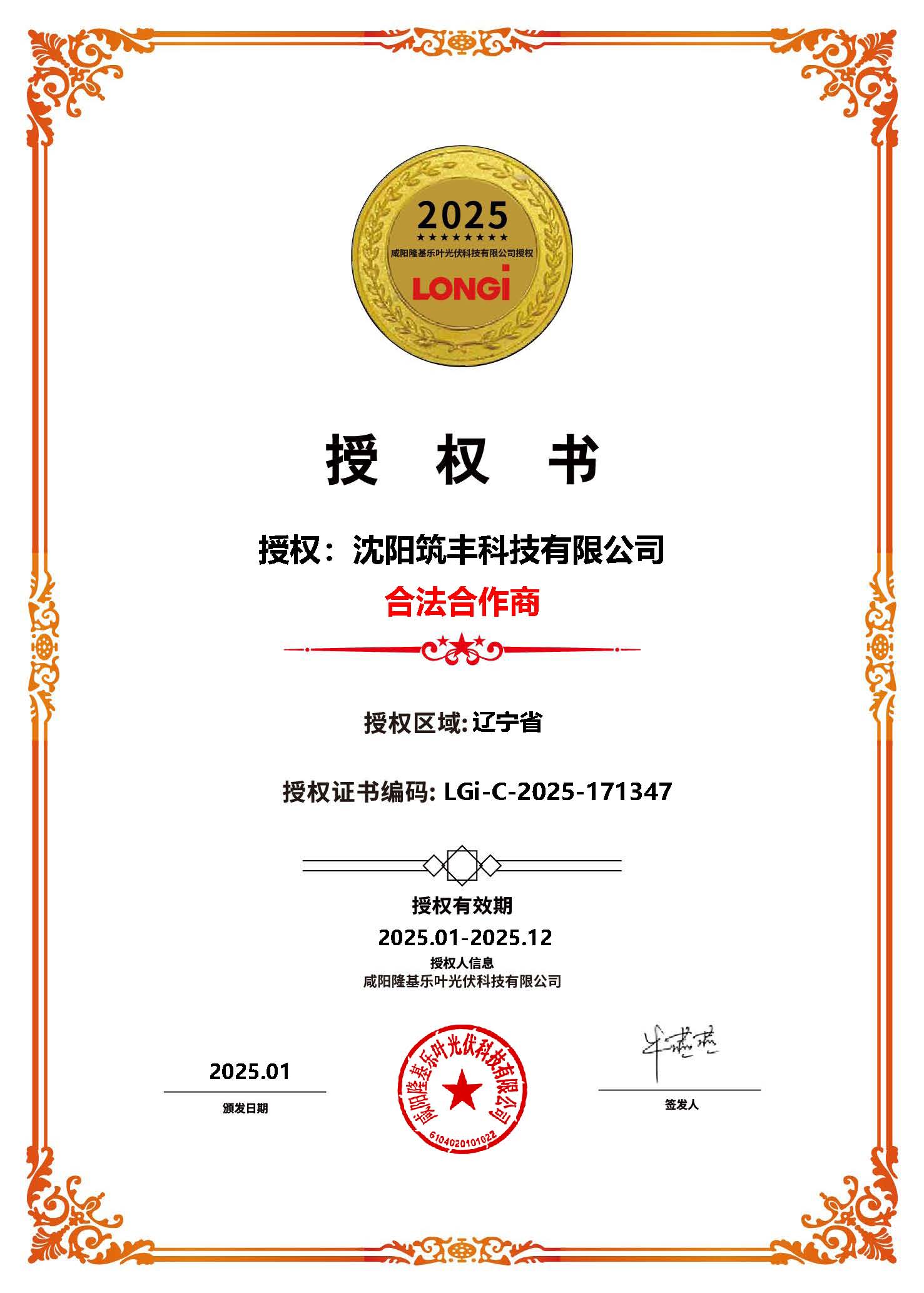 我司榮獲隆基樂葉2025年遼寧省代理商授權